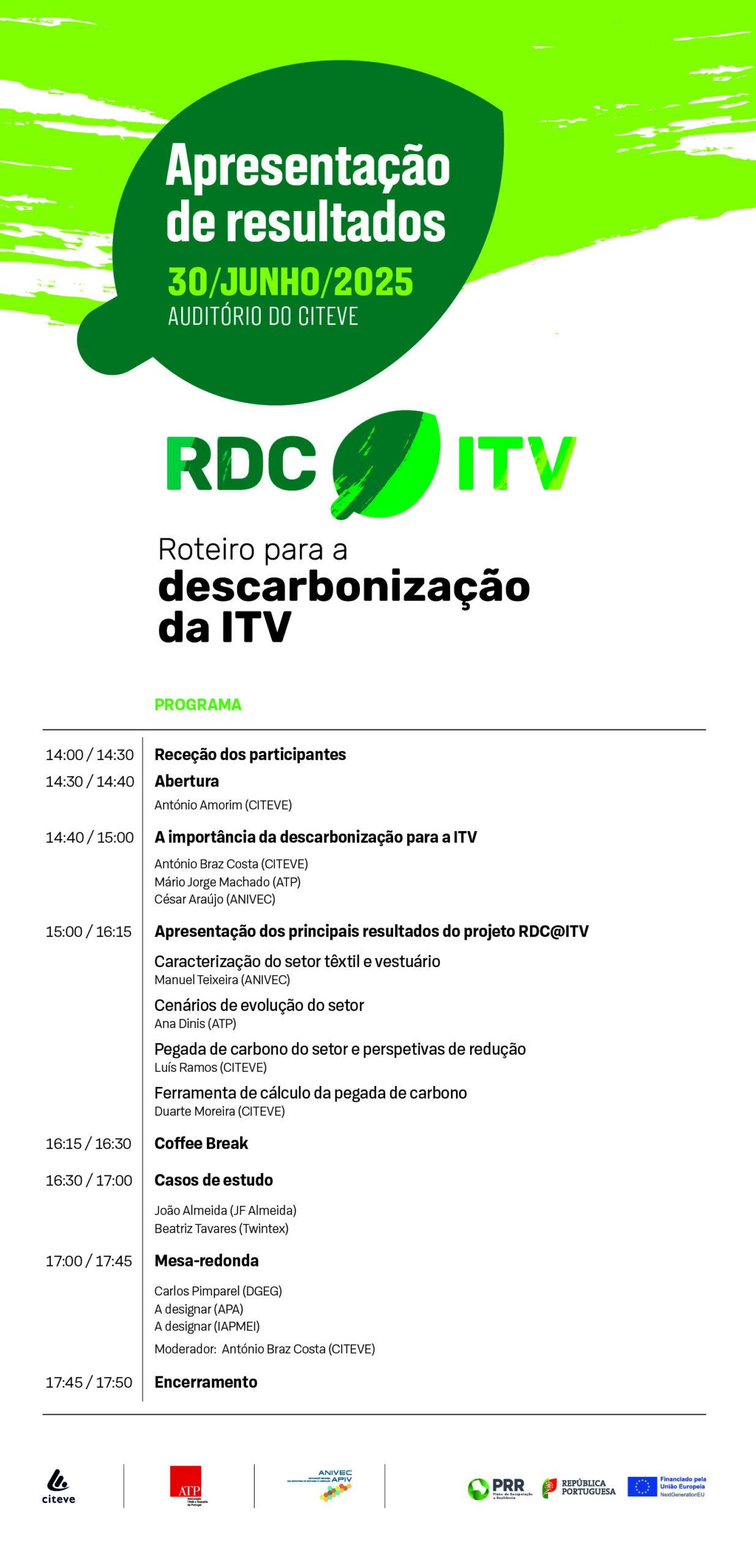 Evento Final do projeto RDC@ITV Roteiro para a Descarbonização do Setor Têxtil e do Vestuário | 30/06/2025 – 14h00 | CITEVE